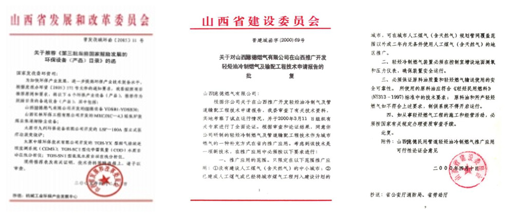輕烴冷制燃氣,1993年前研究的也是加溫制氣,做了107戶供氣,輕烴加溫36度以上就產氣,天氣冷,每天多次排殘液、管道每天排3~5(水)桶凝液(輕烴),火勢不穩,也威脅安全,準備放棄改煤氣;國務院要求發展油制氣,研究不加溫試試,根據汽車用水降溫,摩托車用風降溫不拉缸原理啟示,不兌任何添加劑,將輕烴完全汽化,解決了殘液、凝液問題,專門改裝了1梯6戶,室外明管不保溫,在零下23度沒有凝液,經完善達到了供氣穩定的目的,承建了多個小區,常溫低壓供氣,使用穩定,找不到任何缺點;于2003~2005年八次向黨中央,國務院、有關部委報《喜報》:得到了大力支持,定為《國家鼓勵發展的資源節約綜合利用和環境保護技術項目》、《免稅項目》和《城市燃氣》。